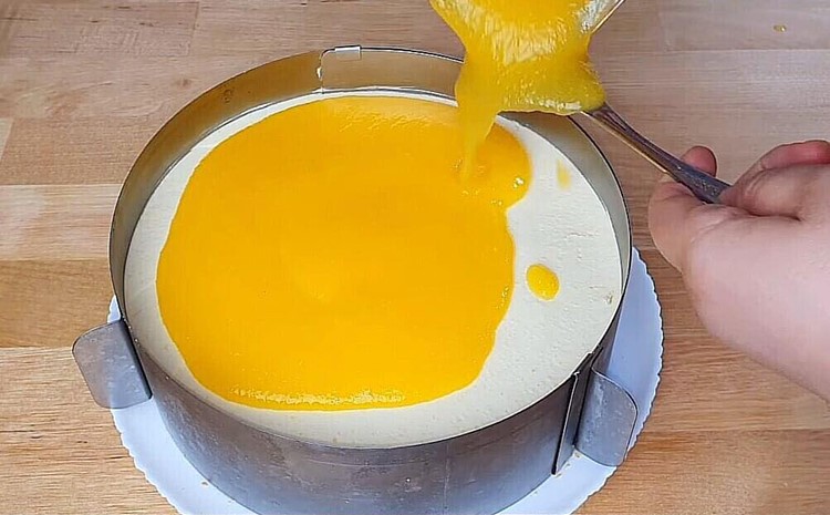 Jetzt diese Masse auf den Biskuitboden verteilen (in der Springform lassen).