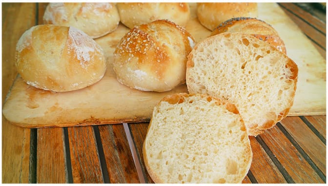 - Jetzt die Brötchen mit Milch bestreichen und auf der mittleren Schiene in ca. 20 – 25 Minuten goldgelb backen. Herausnehmen und etwas abkühlen lassen.