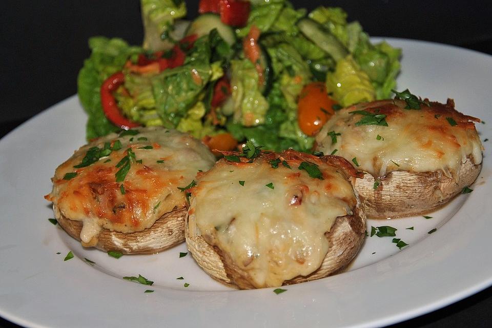 - Die Mischung in die Pilze füllen, über jeden Pilz etwas geriebenen Käse streuen, die Pilze in den Ofen schieben und etwa 15 – 20 Minuten, bis die Pilze schön überbacken sind und der Käse leicht bräunt, überbacken.