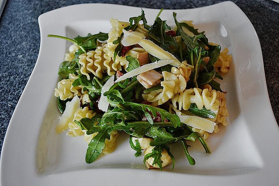 - Die Pinienkerne ohne Fett und bei mittlerer Hitze in der Pfanne leicht anbräunen. Rucola waschen, trocken schleudern und zerkleinern. Die getrockneten Tomaten und den Mozzarella abtropfen lassen und würfeln. Den Parma- oder Kochschinken in zarte Streifen schneiden. Der Schinken kann auch am Stück gekauft werden, dann bitte würfeln. Die Zutaten in eine große Schüssel geben, vorsichtig durchmischen, salzen und pfeffern.