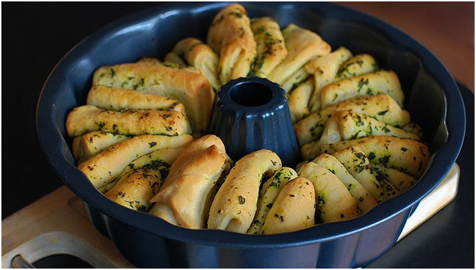 - Dann Teig dann zu einem Viereck ausrollen und mit der Kräuterbutter bestreichen. Das Viereck zu gleichmäßigen Streifen schneiden und diese dann in Falten legen. Die gefalteten Streifen dann von der Mitte ausgehend in eine sehr gut mit Backpapier ausgelegte Springform stellen (hochkant).