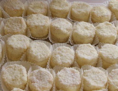 - Vom Biskuit Scheiben mit ca. 6 cm Durchmesser ausstechen und je zwei mit Creme zusammensetzen, rundherum mit Creme bestreichen und in Kokosett wälzen.